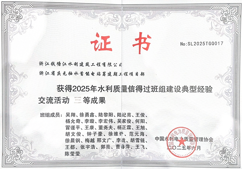 近日,中國(guó)水利電力質(zhì)量管理協(xié)會(huì)公布2025年度水利質(zhì)量信得過(guò)班組建設(shè)典型經(jīng)驗(yàn)交流活動(dòng)評(píng)選結(jié)果,慶元抽蓄籌建期EPC總承包項(xiàng)目憑借扎實(shí)有效的質(zhì)量管理實(shí)踐和突出的建設(shè)成果,榮獲“2025年水利質(zhì)量信得過(guò)班組建設(shè)典型經(jīng)驗(yàn)交流活動(dòng)”三等成果。這一榮譽(yù)不僅為“浙錢(qián)水建”品牌再添光彩,更標(biāo)志著公司在工程質(zhì)量管理領(lǐng)域獲得了行業(yè)權(quán)威機(jī)構(gòu)的高度認(rèn)可。